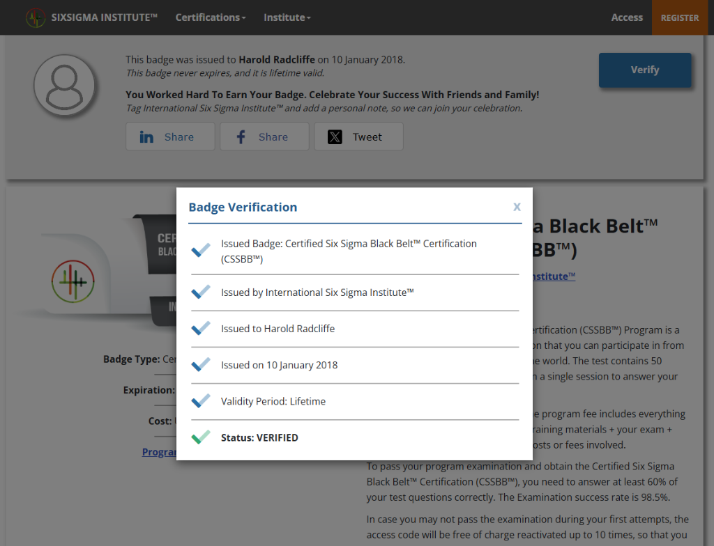 Number of Six Sigma Projects Completed in a Black Belt/Master Black Belt Role (Lifetime): 50-100