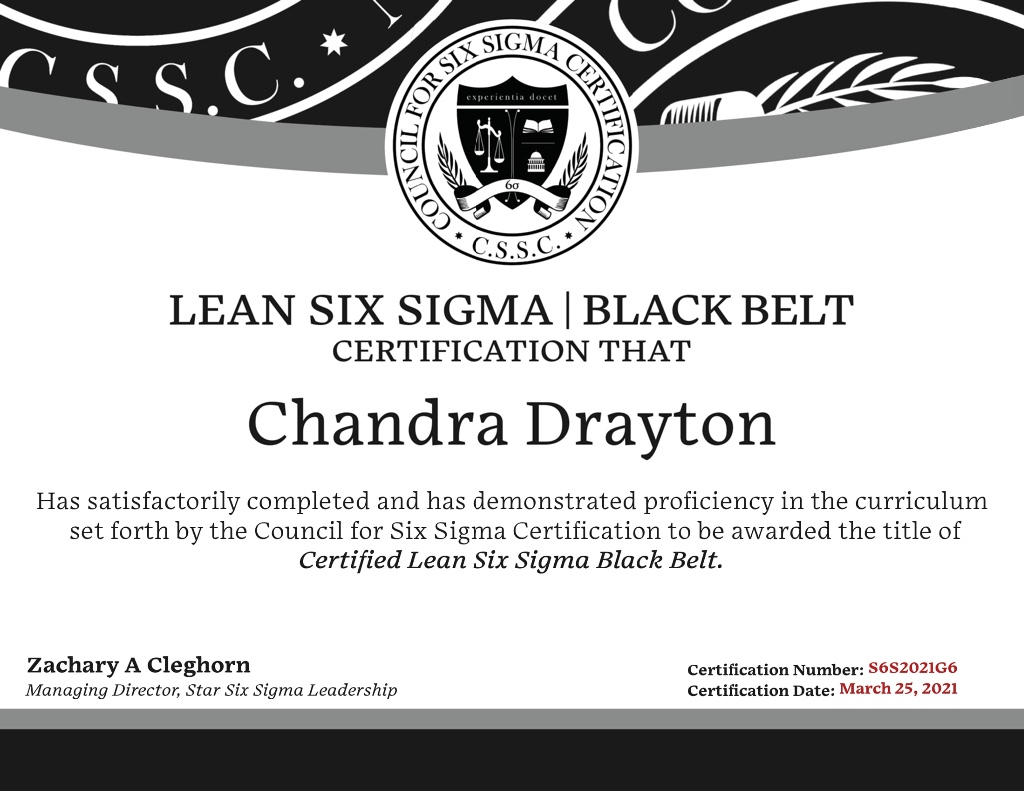 Number of Six Sigma Projects Completed in a Black Belt/Master Black Belt Role (Lifetime): 5
